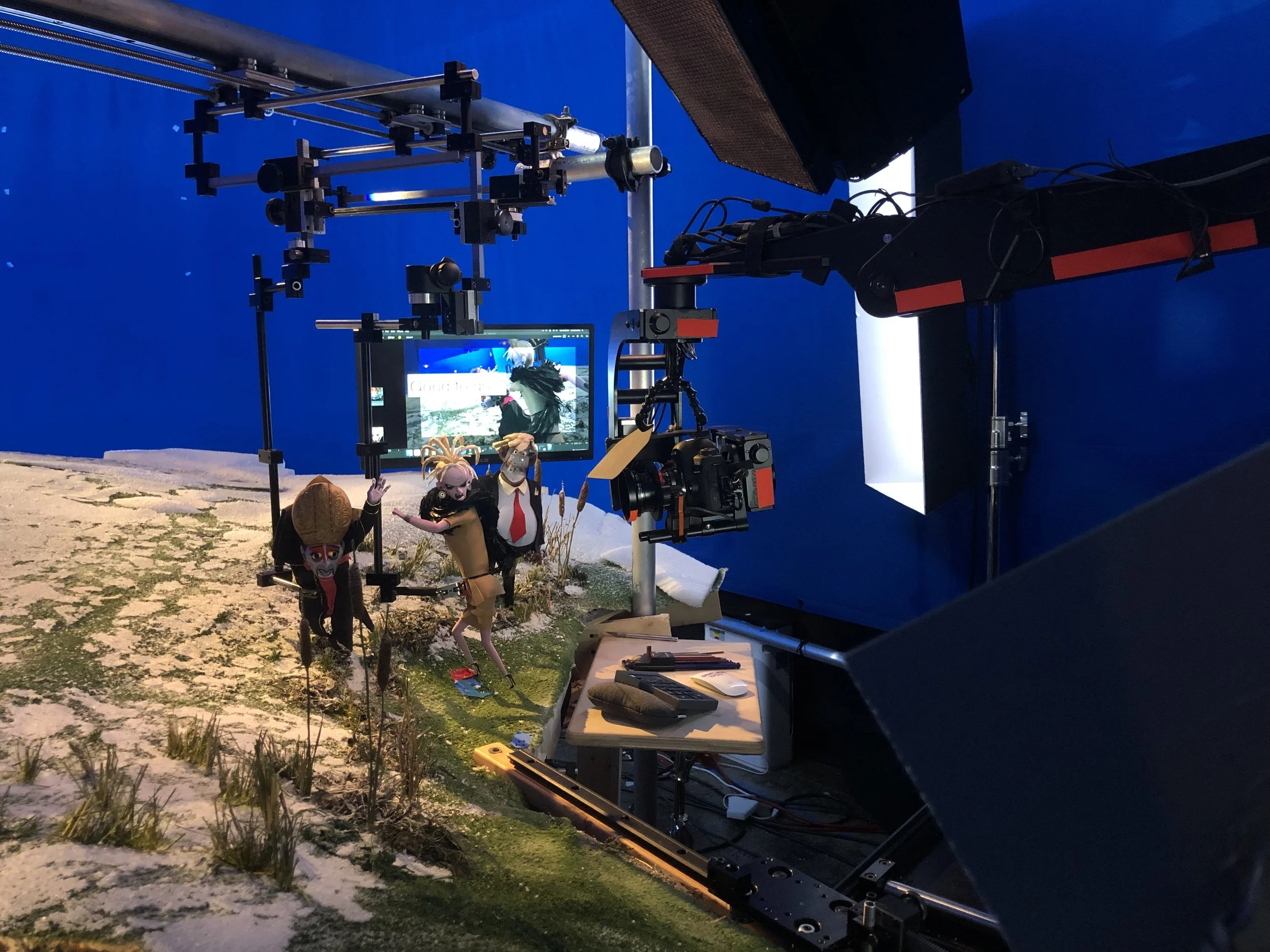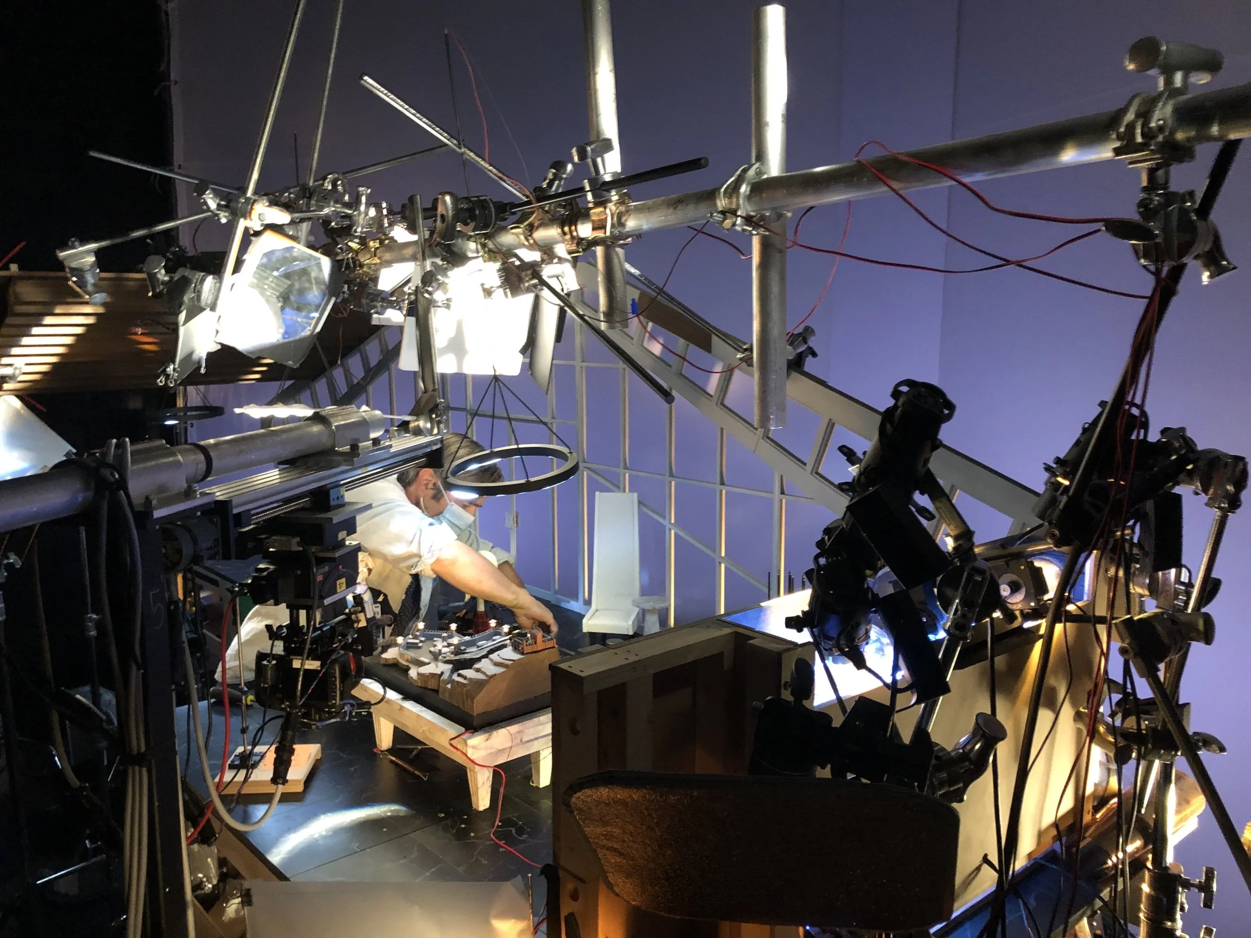 LC Eric Adkins and MOCO OP Matt Emmons planning motion control camera move through the elaborate two story Boxtroll cavern set. This set was comprised of three separate sets that had been shot out previously for this epic setup.